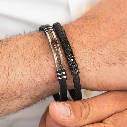 Pulsera de acero inoxidable y cuero Negro con placa central de acero PVD y tornillo H2on HO111-12