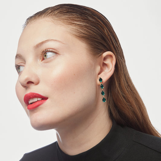 Par de aros largos lágrima color verde bañados en oro